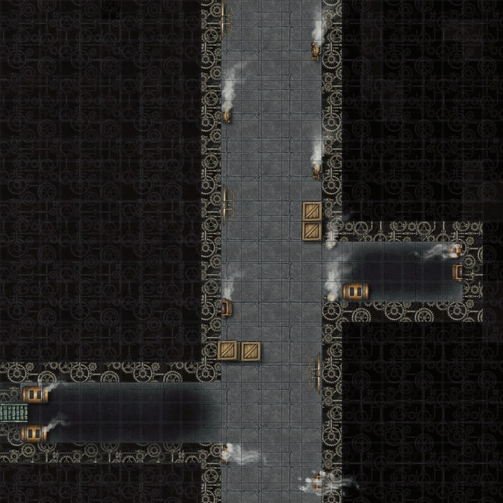 I personally like the simplicity of it, but I also love the mechanical texture of the walls. The crates, Chemtech mechanical devices, fans, etc. can all be used as cover, and you never know what threat may be lurking in an alley in the fog of war. This was my first map made using Inkarnate Pro.