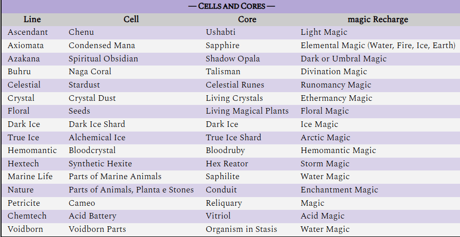 Below are the different Techmaturgical Lines and the Base Materials for Cells and Cores in that line.