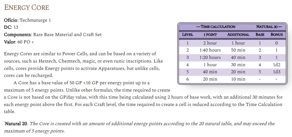 The Correct way to calculate creating a Cell, Core, and Reactor is actually different than the other devices. It simply follows the table shown above (or on the actual formula). So if we wanted a 1-energy Core at Techmaturgy Level 2, we would just spend the 1 hour and 40 minutes, spend the money, and roll the check.