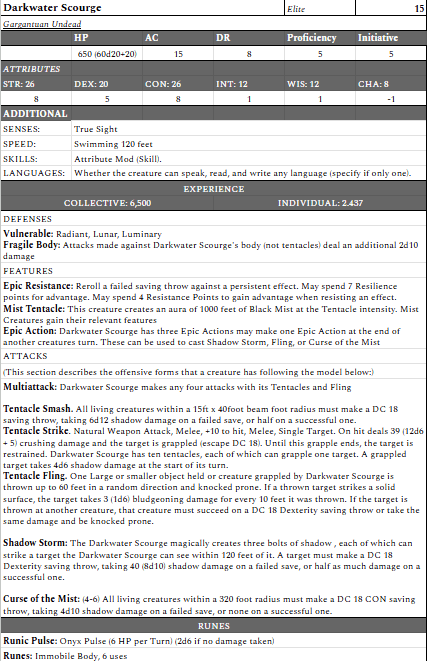 - The Darkwater Scourge has three Epic Actions to use after players’ turns, prioritizing those who deal the most damage