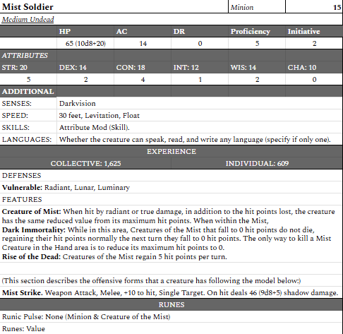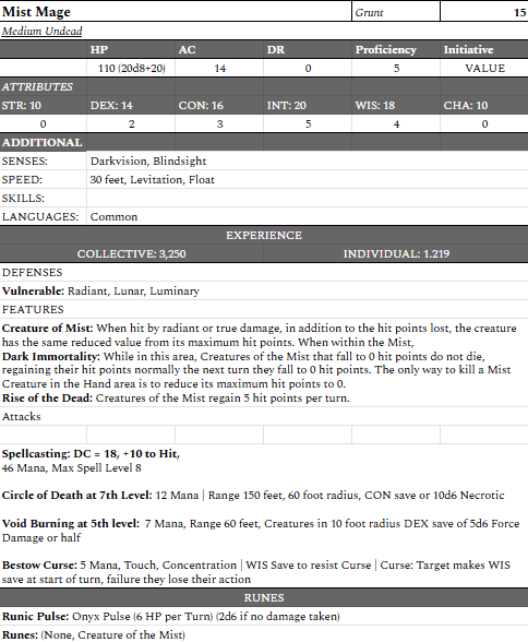 The stat blocks are below. Click them to enlarge them and see the details. The only important note to make that isn’t covered clearly on the stat blocks is that for my Mist Mages, I pre-selected the levels at which they cast their spells and pre-selected a choice for Bestow Curse so that I could just track mana and not need to think to hard or spend more space than needed. If you want more flexibility, just take note of the spells and deal with them normally.