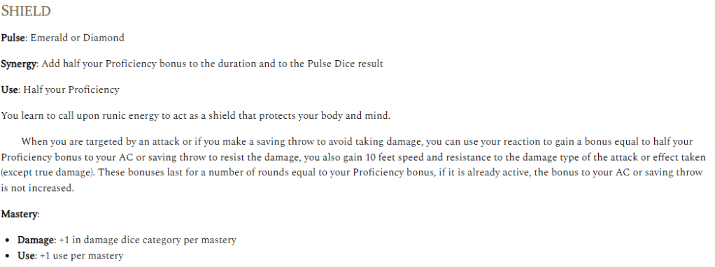Pulse & Synergy: Is connected to the Emerald and Diamond Pulses, so if you have them (which we do), you get the Synergy effect of adding half your proficiency bonus to the duration of Shield and to the Pulse Dice result. If you don’t have Emerald or Diamond as your Pulse, you can still use Shield, you just don’t get the Synergy effect. As shown in the Pulse Dice table earlier, since we’re level 3, we have a Proficiency Bonus of 2 and a Pulse Die of 1d4. We’ll have to look at the actual effect before we know what this means.